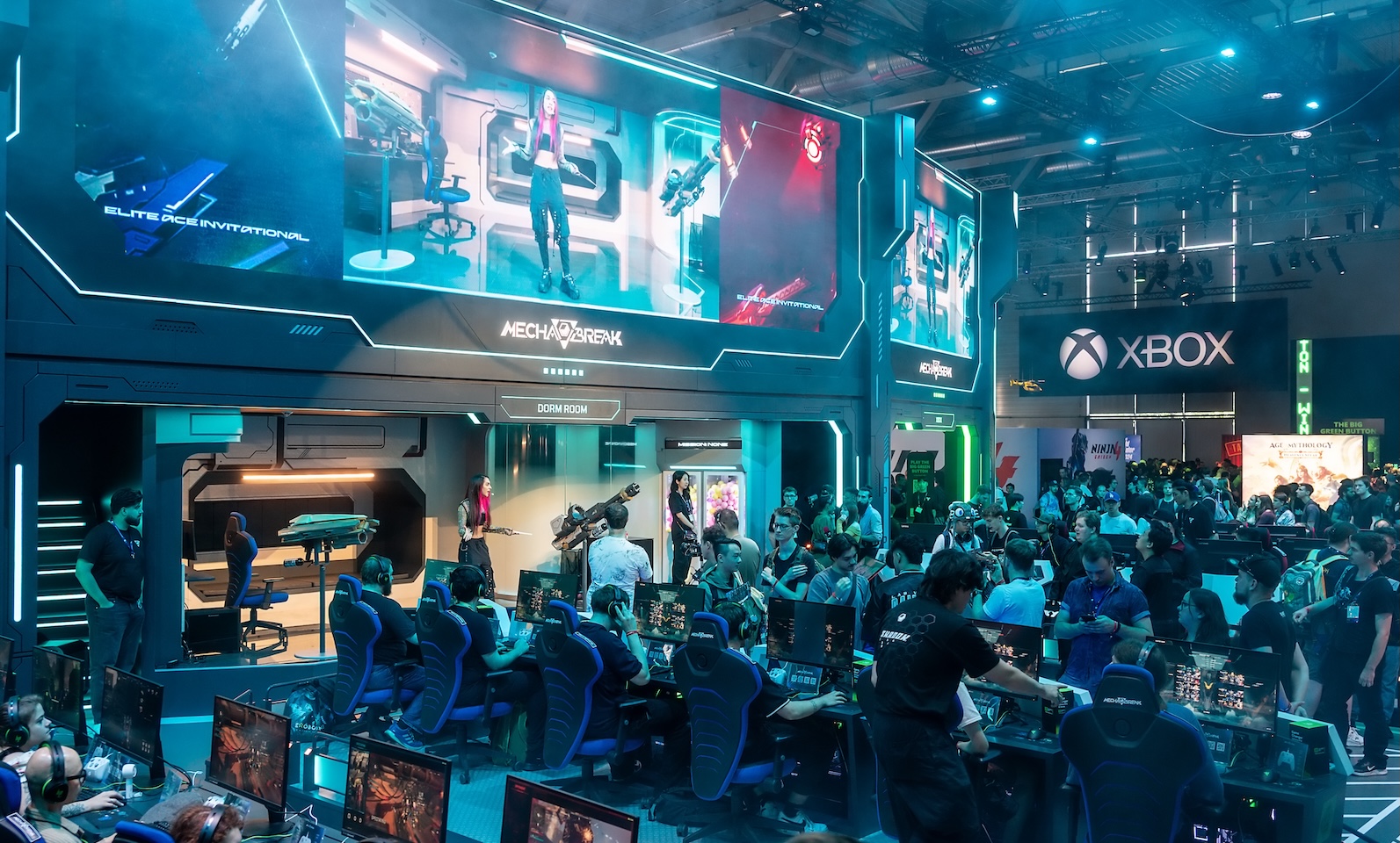 EIDETIC designed the Mecha BREAK booth as a cybernetic hangar to reflect the game’s sci-fi and mecha-shooter identity. With custom weapon props, intricate motifs, and thematic decorations, the entire booth embodied the world of mecha. A full-scale cockpit simulator offered participants an immersive experience of piloting their own mech, earning praise as “one of the most impressive booths at Gamescom.” To highlight the game’s strategic PvPvE battles, a dedicated arena was created, delivering thrilling live matches. The front-facing LED screens broadcasted the action in real time, drawing in large crowds of spectators.